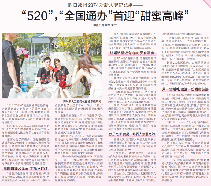 2025年“520”的浪漫钟声已经敲响,这是婚姻登记新规遇上的首个“520”。今年5月10日,新修订的《婚姻登记条例》正式实施,婚姻登记可以“全国通办”。新政策实施后,郑州市婚姻登记预约量激增。(今日《郑州日报》7版)