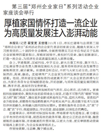 11月1日,市长庄建球与出席第三届“郑州企业家日”系列活动的企业家代表亲切座谈交流,勉励大家深入学习贯彻党的二十届四中全会精神,全面贯彻落实习近平总书记关于弘扬企业家精神的重要指示,厚植家国情怀,勇担时代使命,强化创新意识,打造一流企业,为经济社会高质量发展注入澎湃动能。(今日《郑州日报》1版)
