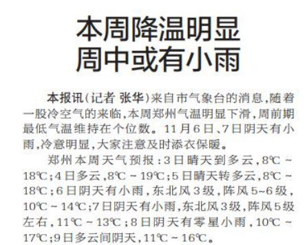 来自市气象台的消息,随着一股冷空气的来临,本周郑州气温明显下滑,周前期最低气温维持在个位数。11月6日、7日阴天有小雨,冷意明显,大家注意及时添衣保暖。(今日《郑州日报》2版)