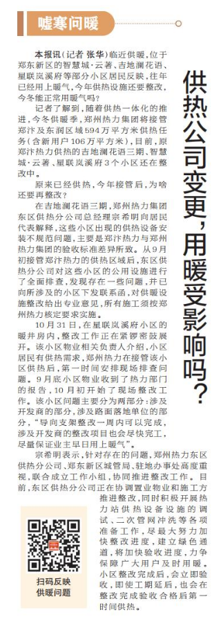 临近供暖,位于郑东新区的智慧城·云著、吉地澜花语、星联岚溪府等部分小区居民反映,往年已经用上暖气,今年供热设施还要整改,今冬能正常用暖气吗?(今日《郑州日报》2版)