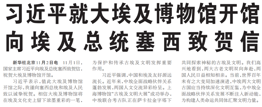 11月1日,国家主席习近平向埃及总统塞西致贺信,祝贺大埃及博物馆开馆。(今日《人民日报》1版)