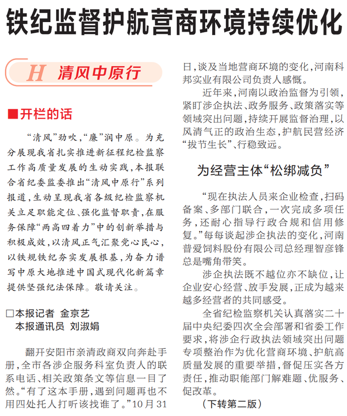 翻开安阳市亲清政商双向奔赴手册,全市各涉企服务科室负责人的联系电话、相关政策条文等信息一目了然。“有了这本手册,遇到问题再也不用四处托人打听该找谁了。”10月31日,谈及当地营商环境的变化,河南科邦实业有限公司负责人感慨。(今日《河南日报》1版、2版)