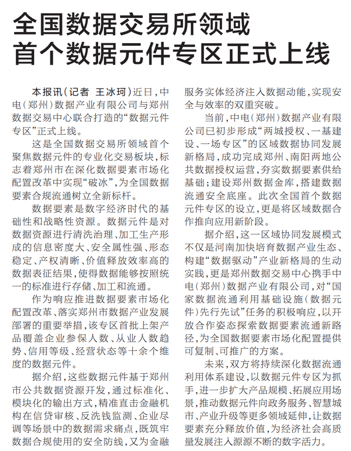 近日,中电(郑州)数据产业有限公司与郑州数据交易中心联合打造的“数据元件专区”正式上线。(今日《河南日报》2版)