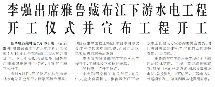 雅鲁藏布江下游水电工程开工仪式7月19日上午在西藏自治区林芝市举行。中共中央政治局常委、国务院总理李强出席开工仪式,并宣布工程正式开工。(今日《人民日报》1版)