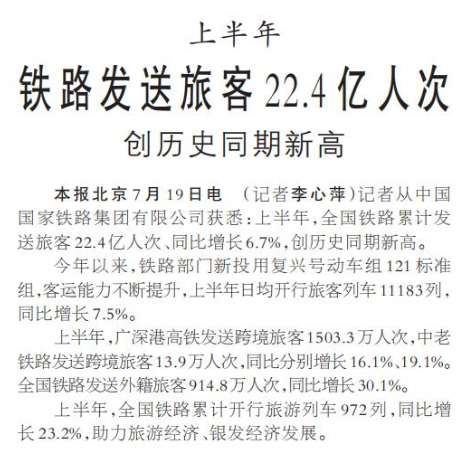 记者从中国国家铁路集团有限公司获悉:上半年,全国铁路累计发送旅客22.4亿人次、同比增长6.7%,创历史同期新高。(今日《人民日报》1版)