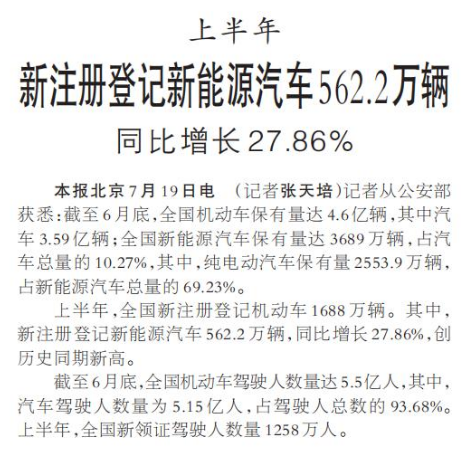 上半年新注册登记新能源汽车562.2万辆