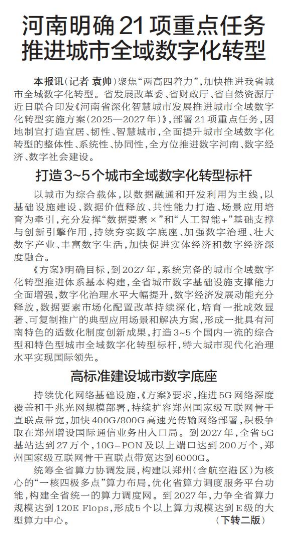 聚焦“两高四着力”,加快推进我省城市全域数字化转型。省发展改革委、省财政厅、省自然资源厅近日联合印发《河南省深化智慧城市发展推进城市全域数字化转型实施方案(2025—2027年)》,部署21项重点任务,因地制宜打造宜居、韧性、智慧城市,全面提升城市全域数字化转型的整体性、系统性、协同性,全方位推进数字河南、数字经济、数字社会建设。(今日《郑州日报》1版、2版)