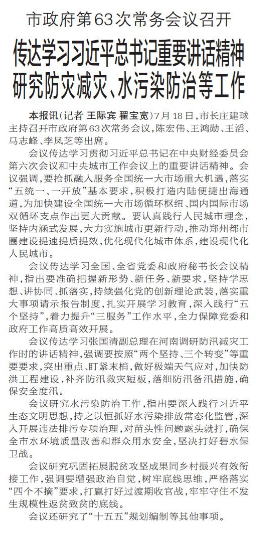 7月18日,市长庄建球主持召开市政府第63次常务会议,陈宏伟、王鸿勋、王滔、马志峰、李凤芝等出席。(今日《郑州日报》1版)