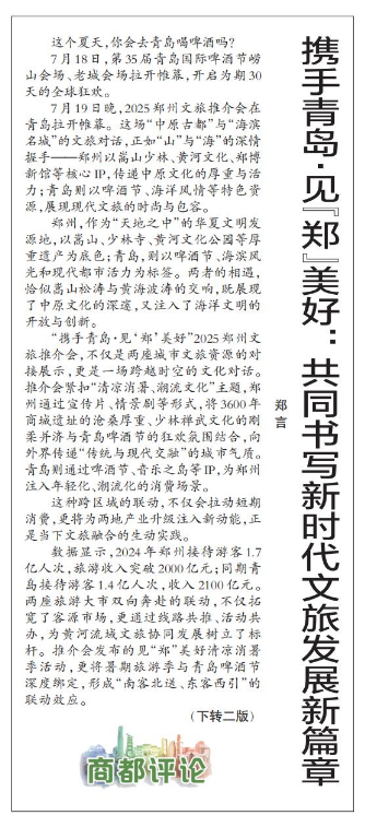 郑州与青岛,一个地处黄河之滨,一个位于黄海之畔。在第35届青岛国际啤酒节火热进行之时,郑州代表团跨越山海而来,一场文旅交融的双城对话就此开启。(今日《郑州日报》2版)