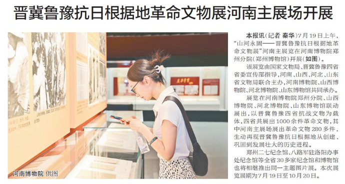 7月19日上午,“山河永固——晋冀鲁豫抗日根据地革命文物展”河南主展览在河南博物院郑州分院(郑州博物馆)开展。(今日《郑州日报》1版、2版)