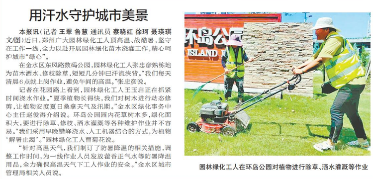 近日,郑州广大园林绿化工人顶高温、战酷暑,坚守在工作一线,全力以赴开展园林绿化苗木浇灌工作,精心呵护城市“绿心”。(今日《郑州日报》2版)