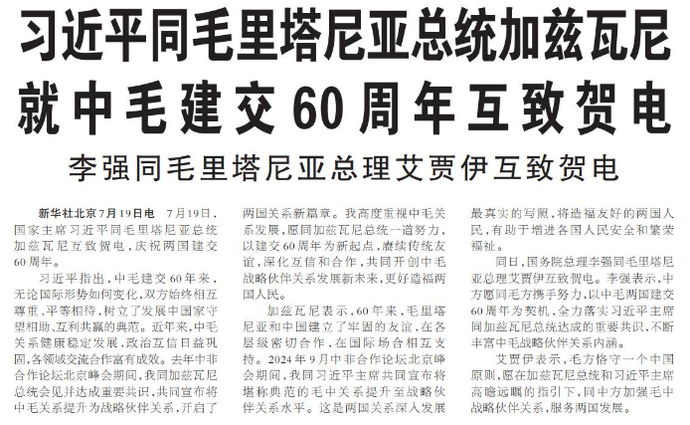 7月19日,国家主席习近平同毛里塔尼亚总统加兹瓦尼互致贺电,庆祝两国建交60周年。(今日《人民日报》1版)