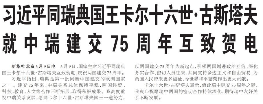 5月9日,国家主席习近平同瑞典国王卡尔十六世·古斯塔夫互致贺电,庆祝两国建交75周年。(今日《人民日报》1版)