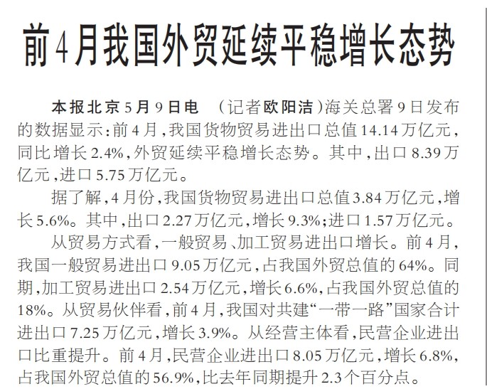 前4月我国外贸延续平稳增长态势