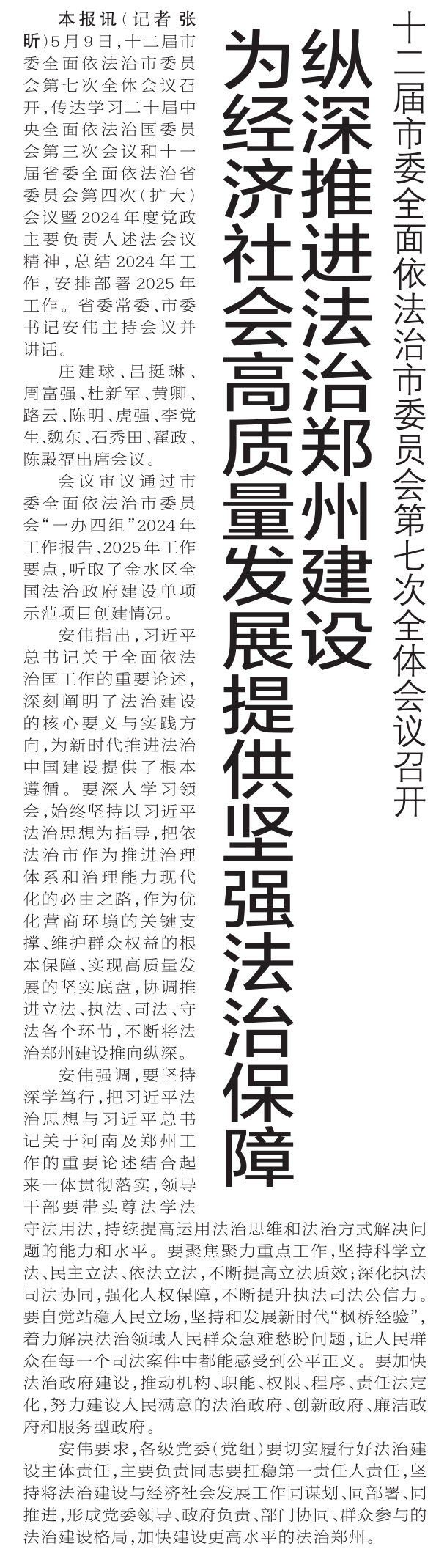 5月9日,十二届市委全面依法治市委员会第七次全体会议召开,传达学习二十届中央全面依法治国委员会第三次会议和十一届省委全面依法治省委员会第四次(扩大)会议暨2024年度党政主要负责人述法会议精神,总结2024年工作,安排部署2025年工作。省委常委、市委书记安伟主持会议并讲话。(今日《郑州日报》1版)