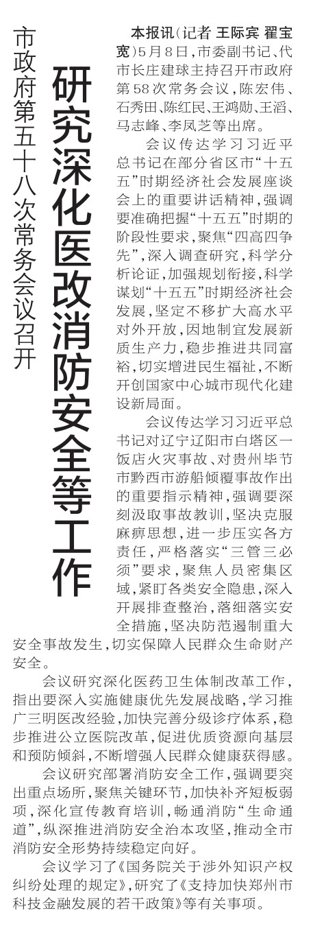 5月8日,市委副书记、代市长庄建球主持召开市政府第58次常务会议,陈宏伟、石秀田、陈红民、王鸿勋、王滔、马志峰、李凤芝等出席。(今日《郑州日报》1版)