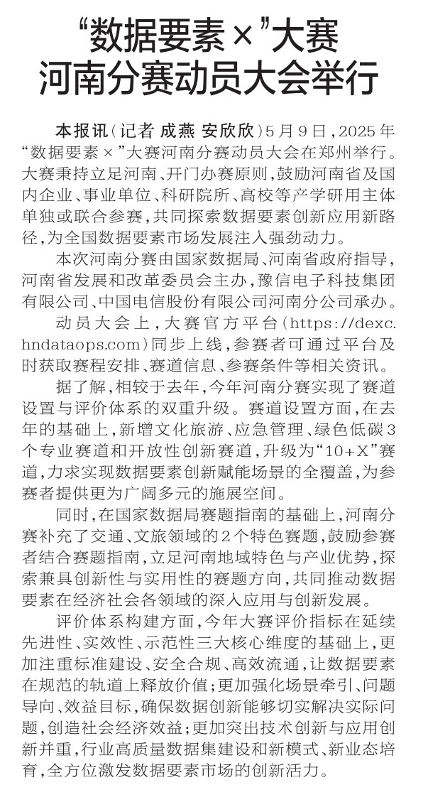 5月9日,2025年“数据要素×”大赛河南分赛动员大会在郑州举行。大赛秉持立足河南、开门办赛原则,鼓励河南省及国内企业、事业单位、科研院所、高校等产学研用主体单独或联合参赛,共同探索数据要素创新应用新路径,为全国数据要素市场发展注入强劲动力。(今日《郑州日报》2版)