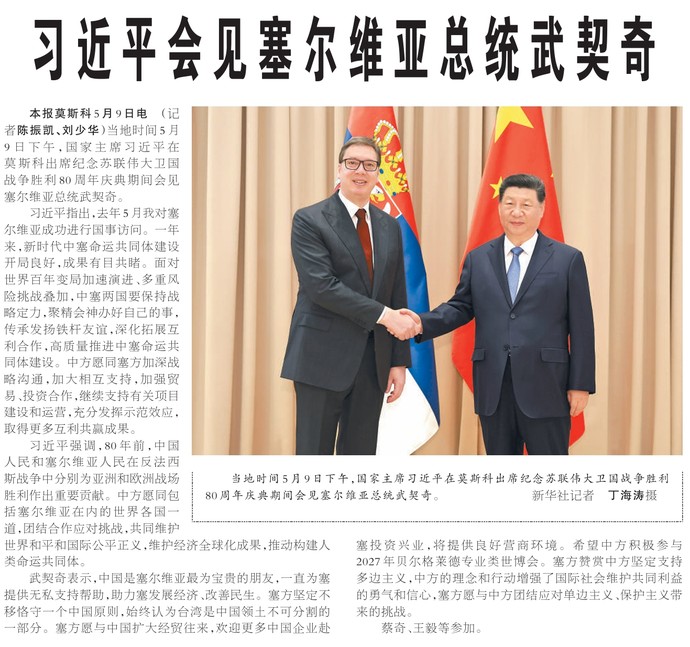 当地时间5月9日下午,国家主席习近平在莫斯科出席纪念苏联伟大卫国战争胜利80周年庆典期间会见塞尔维亚总统武契奇。(今日《人民日报》2版)