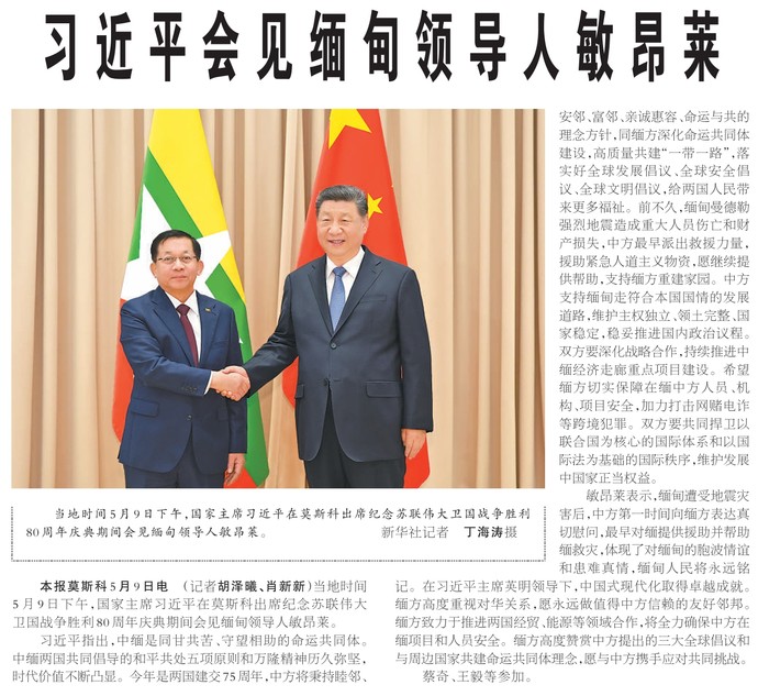当地时间5月9日下午,国家主席习近平在莫斯科出席纪念苏联伟大卫国战争胜利80周年庆典期间会见缅甸领导人敏昂莱。(今日《人民日报》2版)