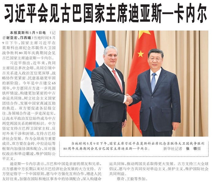 当地时间5月9日下午,国家主席习近平在莫斯科出席纪念苏联伟大卫国战争胜利80周年庆典期间会见古巴国家主席迪亚斯—卡内尔。(今日《人民日报》2版)