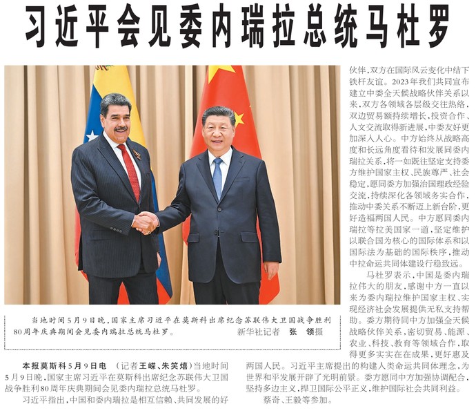 当地时间5月9日晚,国家主席习近平在莫斯科出席纪念苏联伟大卫国战争胜利80周年庆典期间会见委内瑞拉总统马杜罗。(今日《人民日报》2版)