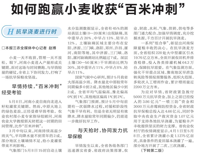 小麦一天不收获,管理一天不放松。眼下,河南小麦进入产量形成关键期,面对这场与时间赛跑、与旱情较量的硬仗,全省上下协同发力,打响了一场抗旱保粮攻坚战。(今日《河南日报》1版、2版)