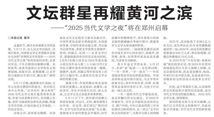 孟夏时节,黄河水奔涌着文学的浪潮。5月11日,由人民文学出版社、河南日报社、河南省文学艺术界联合会联合主办的“世界因文学而美好——2025当代文学之夜”将再次如约而至,在黄河岸边、千年古都郑州璀璨启幕。名家新秀、读者书迷将以文学的名义相聚绿城,深度对话、思想碰撞,让文学的力量跃出字里行间,触达更广阔的天地。(今日《河南日报》2版)