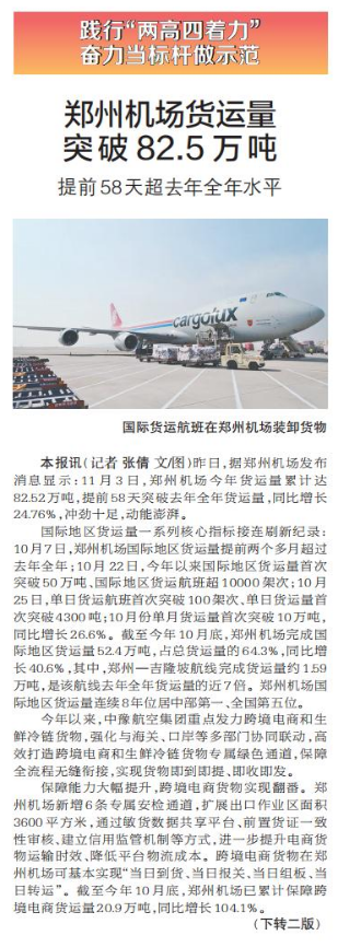 昨日,据郑州机场发布消息显示:11月3日,郑州机场今年货运量累计达82.52万吨,提前58天突破去年全年货运量,同比增长24.76%,冲劲十足,动能澎湃。(今日《郑州日报》1版、2版)