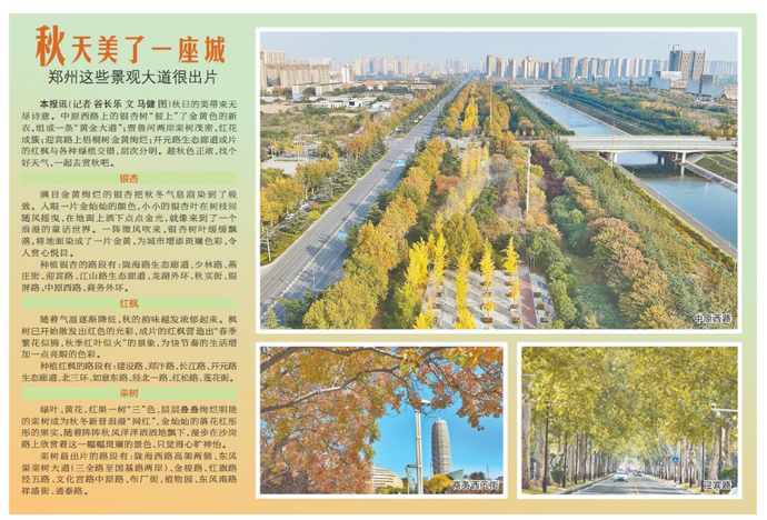 秋日的美带来无尽诗意。中原西路上的银杏树“披上”了金黄色的新衣,组成一条“黄金大道”;贾鲁河两岸栾树茂密,红花成簇;迎宾路上梧桐树金黄绚烂;开元路生态廊道成片的红枫与各种绿植交错,层次分明。趁秋色正浓,找个好天气,一起去赏秋吧。(今日《郑州日报》2版)