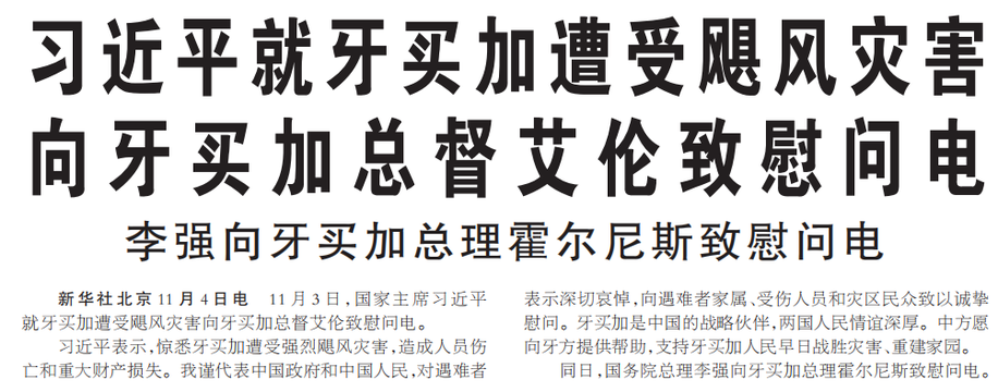 11月3日,国家主席习近平就牙买加遭受飓风灾害向牙买加总督艾伦致慰问电。(今日《人民日报》1版)