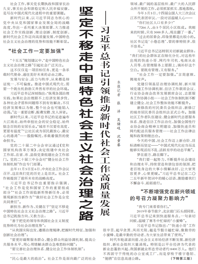 社会工作,事关党长期执政和国家长治久安,事关社会和谐稳定和人民幸福安康,是写在中国式现代化进程中的重要课题。(今日《人民日报》1版、3版)