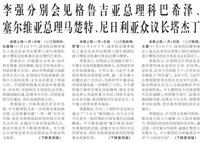 11月4日下午,国务院总理李强在上海会见来华出席第八届中国国际进口博览会的塞尔维亚总理马楚特。(今日《人民日报》1版、4版)