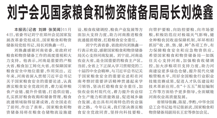 11月4日,省委书记刘宁在郑州会见国家发展改革委党组成员,国家粮食和物资储备局党组书记、局长刘焕鑫一行。(今日《河南日报》1版)