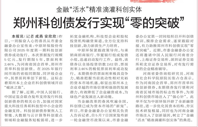 昨日,一则振奋人心的喜讯从市委金融委办公室传来:中原环保股份有限公司2025年度第一期科技创新债券成功发行。本次票据发行规模5亿元,发行期限5年,票面利率2.46%,为河南省国企首单、郑州市首单科技创新债。在2025年银行间市场的省级同期限、同评级企业中,其票面利率创下新低。这标志着郑州本土企业在科创债领域开启 “破冰之旅”。(今日《郑州日报》1版)