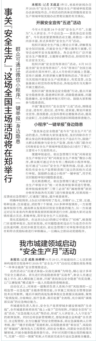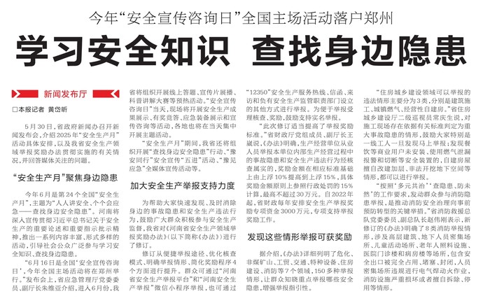 昨日,省政府新闻办召开2025年“安全生产月”暨安全生产领域举报奖励办法新闻发布会,介绍活动的具体安排暨我省安全生产领域举报奖励办法贯彻实施的有关情况。(今日《郑州日报》2版)