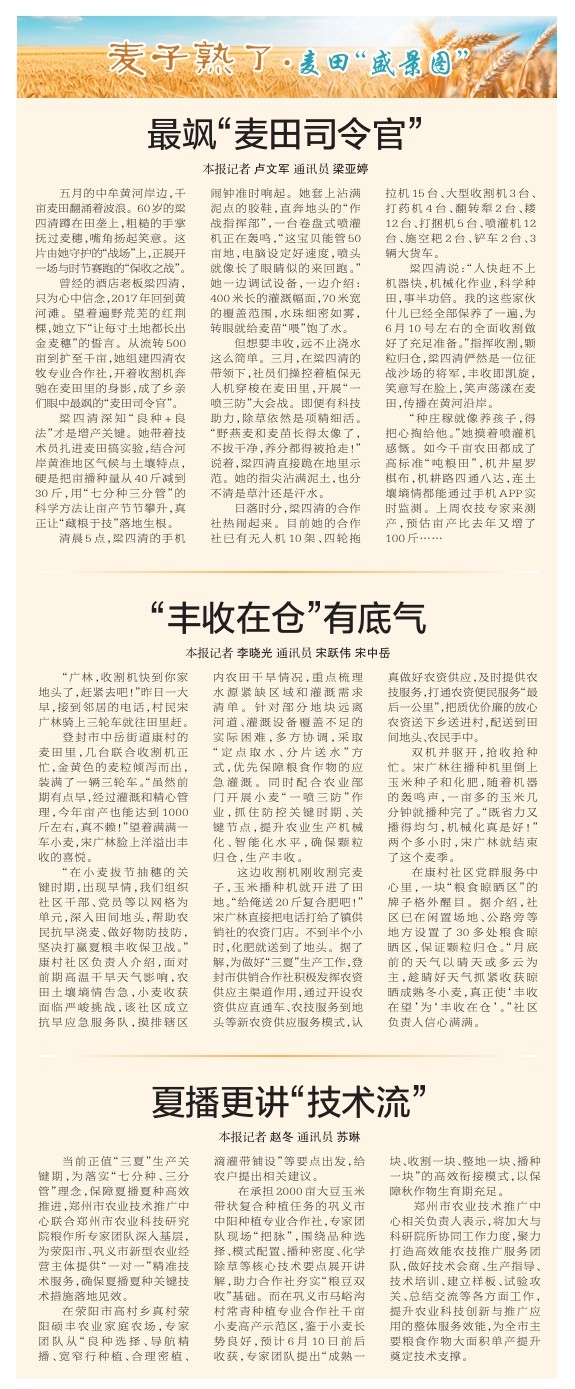 五月的中牟黄河岸边,千亩麦田翻涌着波浪。60岁的梁四清蹲在田垄上,粗糙的手掌抚过麦穗,嘴角扬起笑意。这片由她守护的“战场”上,正展开一场与时节赛跑的“保收之战”。(今日《郑州日报》2版)