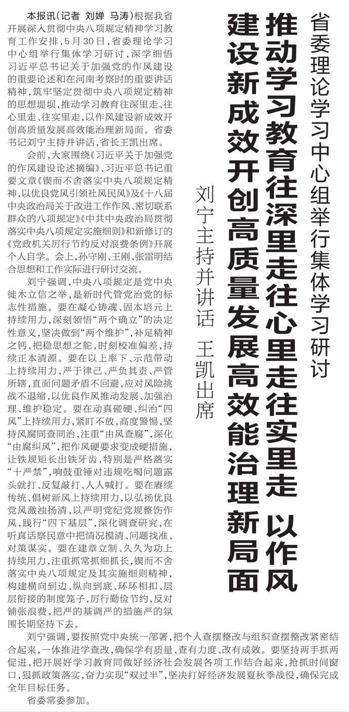 根据我省开展深入贯彻中央八项规定精神学习教育工作安排,5月30日,省委理论学习中心组举行集体学习研讨,深学细悟习近平总书记关于加强党的作风建设的重要论述和在河南考察时的重要讲话精神,筑牢坚定贯彻中央八项规定精神的思想堤坝,推动学习教育往深里走、往心里走、往实里走,以作风建设新成效开创高质量发展高效能治理新局面。省委书记刘宁主持并讲话,省长王凯出席。(今日《河南日报》1版)