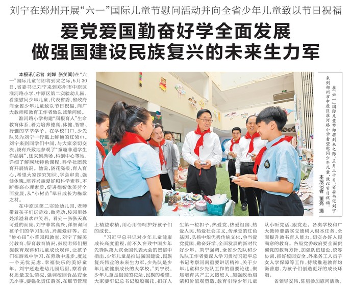 在“六一”国际儿童节即将到来之际,5月30日,省委书记刘宁来到郑州市中原区淮河路小学、中原区第二实验幼儿园,看望慰问少年儿童,代表省委、省政府向全省少年儿童致以节日祝福,向广大教师和教育工作者致以诚挚问候。(今日《河南日报》1版)