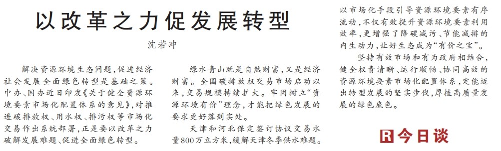 解决资源环境生态问题,促进经济社会发展全面绿色转型是基础之策。中办、国办近日印发《关于健全资源环境要素市场化配置体系的意见》,对推进碳排放权、用水权、排污权等市场化交易作出系统部署,正是要以改革之力破解发展难题、促进全面绿色转型。(今日《人民日报》1版)