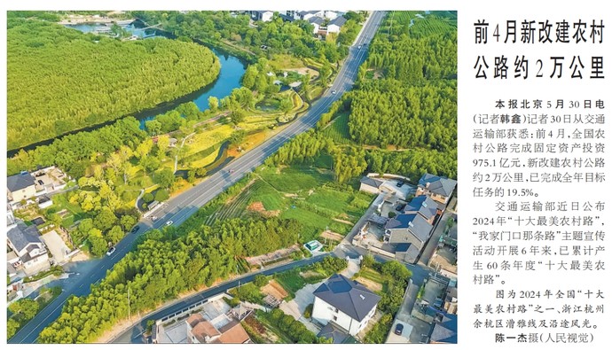 记者30日从交通运输部获悉:前4月,全国农村公路完成固定资产投资975.1亿元,新改建农村公路约2万公里,已完成全年目标任务的19.5%。(今日《人民日报》1版)