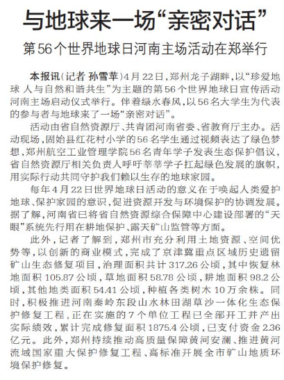 4月22日,郑州龙子湖畔,以“珍爱地球 人与自然和谐共生”为主题的第56个世界地球日宣传活动河南主场启动仪式举行。伴着绿水春风,以56名大学生为代表的参与者与地球来了一场“亲密对话”。(今日《郑州日报》1版)
