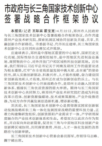4月22日,郑州市人民政府与长三角国家技术创新中心签署战略合作框架协议,合作共建郑州产业技术研究院,探索拓展区域协同创新及共建、共享、共赢创新合作新路径。市委副书记、代市长庄建球,长三角国家技术创新中心主任刘庆出席仪式并致辞。(今日《郑州日报》1版)