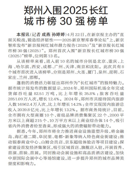 4月22日,在新京报主办的“直面关税战,锻造经济韧性——2025新京智库春季论坛”上,新京智库发布“新京报网红城市潜力报告(2025)”及“新京报长红城市榜30强(2025)”。郑州首次入围“新京报长红城市榜30强(2025)”榜单,位列第13名。(今日《郑州日报》1版)