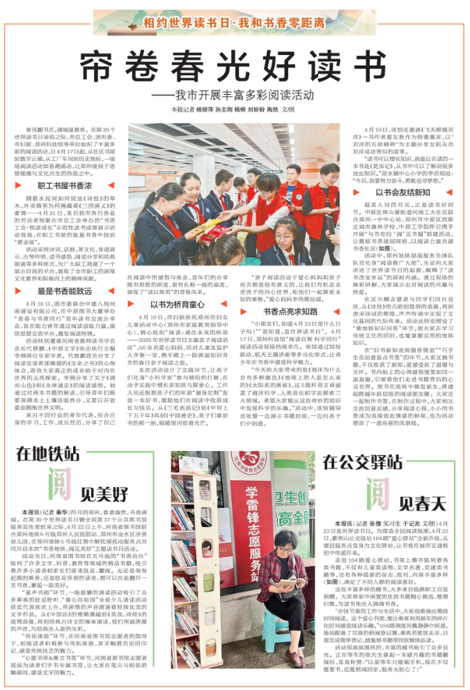 四月的郑州,春意盎然,书香满城。在第30个世界读书日暨全国第37个公共图书馆服务宣传周到来之际,4月22日上午,河南省图书馆联合郑州地铁5号线郑州人民医院站、郑州市金水区济善幼儿园,在郑州地铁5号线红领巾解忧铺流动服务点共同开启本次“书香地铁,阅见美好”主题读书日活动。(今日《郑州日报》2版)