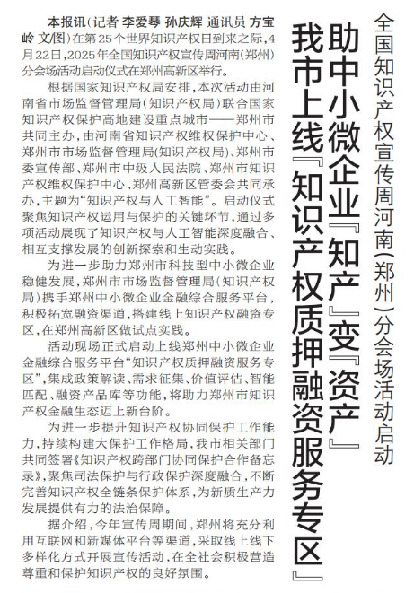 在第25个世界知识产权日到来之际,4月22日,2025年全国知识产权宣传周河南(郑州)分会场活动启动仪式在郑州高新区举行。(今日《郑州日报》2版)