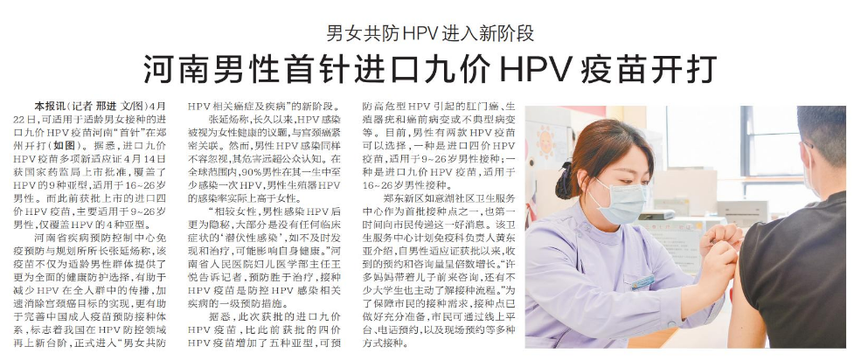 4月22日,可适用于适龄男女接种的进口九价HPV疫苗河南“首针”在郑州开打。据悉,进口九价HPV疫苗多项新适应证4月14日获国家药监局上市批准,覆盖了HPV的9种亚型,适用于16~26岁男性。而此前获批上市的进口四价HPV疫苗,主要适用于9~26岁男性,仅覆盖HPV的4种亚型。(今日《郑州日报》2版)