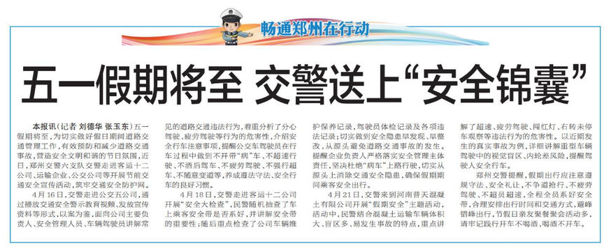 五一假期将至,为切实做好假日期间道路交通管理工作,有效预防和减少道路交通事故,营造安全文明和谐的节日氛围,近日,郑州交警六支队交警走进客运十二公司、运输企业、公交公司等开展节前交通安全宣传活动,筑牢交通安全防护网。(今日《郑州日报》5版)