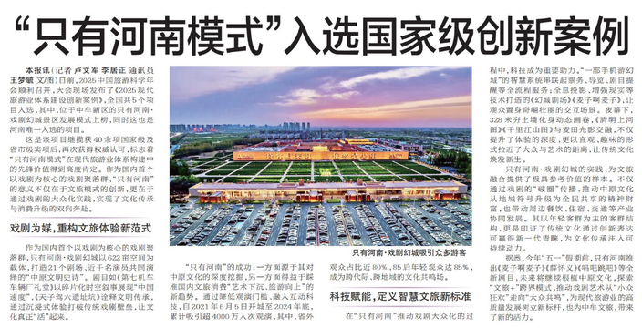 日前,2025中国旅游科学年会顺利召开,大会现场发布了《2025现代旅游业体系建设创新案例》,全国共5个项目入选,其中,位于中牟新区的只有河南·戏剧幻城景区发展模式上榜,同时这也是河南唯一入选的项目。(今日《郑州日报》7版)