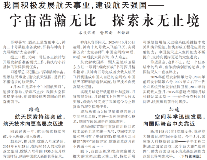 提上日程,天问二号任务正按计划开展发射前准备测试工作,将执行小行星伴飞取样探测任务。(今日《人民日报》1版、4版)