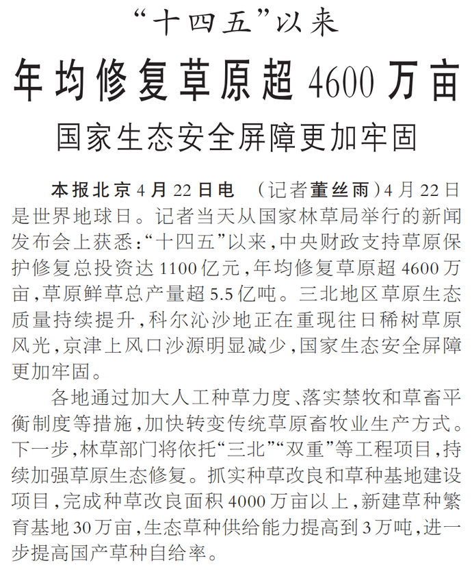 4月22日是世界地球日。记者当天从国家林草局举行的新闻发布会上获悉:“十四五”以来,中央财政支持草原保护修复总投资达1100亿元,年均修复草原超4600万亩,草原鲜草总产量超5.5亿吨。三北地区草原生态质量持续提升,科尔沁沙地正在重现往日稀树草原风光,京津上风口沙源明显减少,国家生态安全屏障更加牢固。(今日《人民日报》1版)
